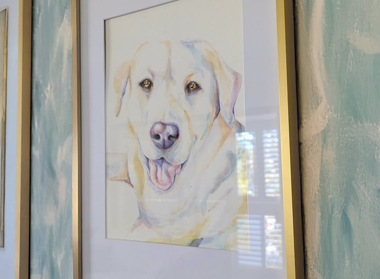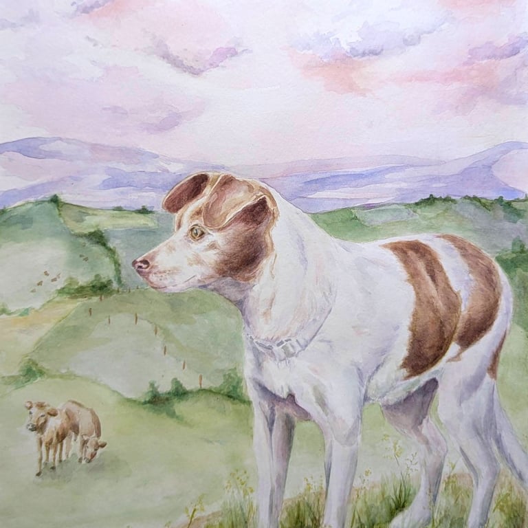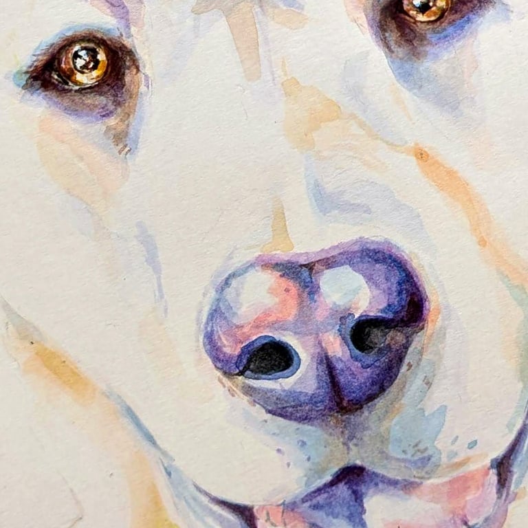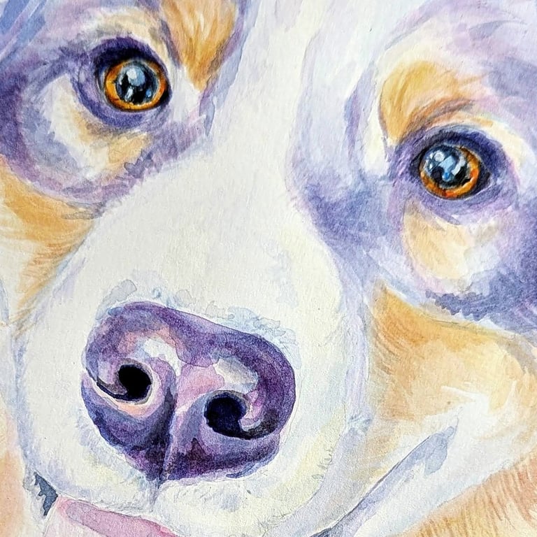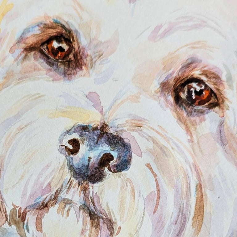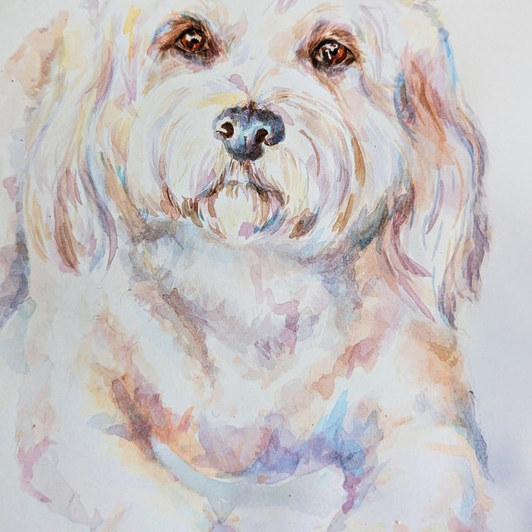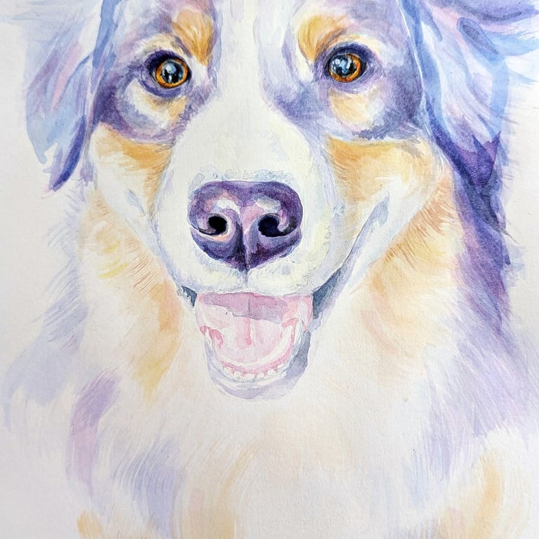 Using bright watercolours on fine art paper, my work isn’t about perfect realism, but about capturing the expression, spirit, and quiet moments that make your pet uniquely them. I spend hours studying their eyes, the tilt of their head, the small details you know by heart.