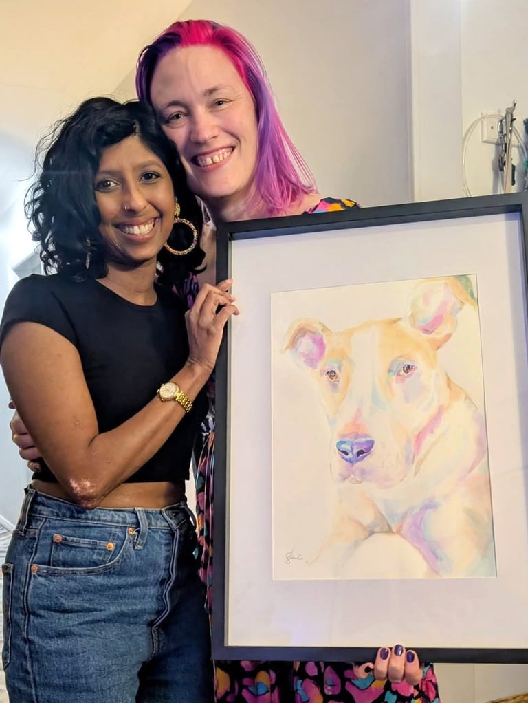 Using bright watercolours on fine art paper, my work isn’t about perfect realism, but about capturing the expression, spirit, and quiet moments that make your pet uniquely them. I spend hours studying their eyes, the tilt of their head, the small details you know by heart.